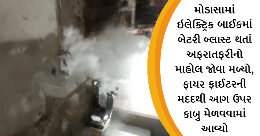 મોડાસામાં ઇલેક્ટ્રિક બાઈકમાં બેટરી બ્લાસ્ટ થતાં અફરાતફરીનો માહોલ જોવા મળ્યો, ફાયર ફાઈટરની મદદથી આગ ઉપર કાબુ મેળવવામાં આવ્યો