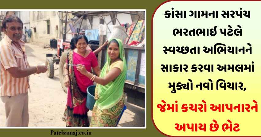 વિસનગર: વિસનગરના કાંસા ગામના સરપંચ ભરતભાઇ પટેલે સ્વચ્છતા અભિયાનને સાકાર કરવા અમલમાં મૂકેલો વિચાર રંગ લાવ્યો છે. અગાઉ ડોર ટુ ડોર કચરો ઉઘરાવતાં આખા ગામમાંથી માંડ બેથી ત્રણ ટ્રેક્ટર એકત્ર થતો હતો. હવે સાતથી આઠ ટ્રેક્ટર કચરો ભેગો થઇ રહ્યો છે. ટ્રેક્ટરમાં કચરો નાખનારને સરપંચ દ્વારા બાળકોને ઉપયોગી બને તેવી પ્રોત્સાહક ભેટ આપવામાં આવે છે. તે પછી બોલપેન કે પેન્સિલ પણ હોઇ શકે છે. આ ભેટનું મૂલ્ય નથી, પણ ગામલોકોમાં સ્વચ્છતા માટે આવેલી જાગૃતિ અમૂલ્ય છે.