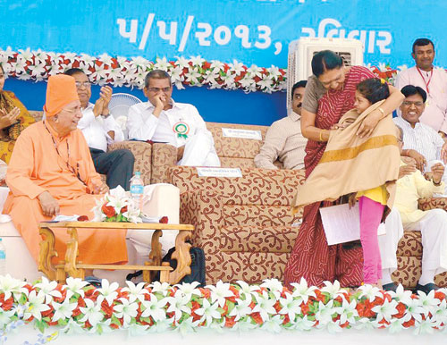 થોડી ક્ષણો માટે તો સ્ટેજ પર બેઠેલા સૌ મહાનુભાવોમાં સન્નાટો છવાઈ ગયો, પણ એ પછી તરત જ નરેન્દ્ર મોદી અને સ્વામી સચ્ચિદાનંદે શપથ માટે હાથ લંબાવ્યો એટલે સ્ટેજના તમામ મહાનુભાવોએ પણ જમણો હાથ લંબાવીને શપથ લીધા એટલું જ નહીં; ભાષાની સ્પીચ પૂરી થઈ એટલે મુખ્ય પ્રધાન નરેન્દ્ર મોદીએ ભાષાને પોતાની પાસે બોલાવી અને તેની સાથે લગભગ પાંચેક મિનિટ વાત કરી. આ પાંચ મિનિટ દરમ્યાન આખો કાર્યક્રમ અટકી ગયો હતો. જે માણસની એક-એક મિનિટનો હિસાબ થતો હોય એ માણસ પાંચ મિનિટ નવ વર્ષની દીકરીને ફાળવે અને એ વાતચીત દરમ્યાન નાના છોકરાની જેમ ખડખડાટ હસે એ ખરેખર નવાઈની વાત હતી. આ નવાઈ BJP; ગુજરાત સરકારના અધિકારીઓ અને ફંક્શનમાં હાજર રહેલા સૌને તો લાગી; પણ સાથોસાથ દેશભરના મિડિયાવાળાઓને પણ લાગી.