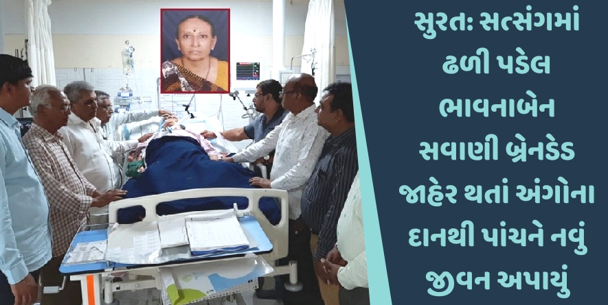 વરાછા વિસ્તારમાં આવેલા મમતાપાર્કમાં રહેતાં ભાવનાબેન મુળજીભાઈ સવાણી (ઉ.વ.આ.62) પાડોશમાં સત્સંગમાં ગયાં હતાં. જ્યાં ચાલુ ભજન કિર્તન દરમિયાન અચાનક ઢળી પડતાં હોસ્પિટલ લઈ જવાયાં હતાં. જ્યાં તેમને મગજમાં ગંભીર ઈજાઓ હોવાનું નિદાન થયું હતું. બાદમાં સિટી સ્કેન અને નિદાનમાં મગજની નસો ફાટી ગઈ હોવાનું જાણવા મળ્યું હતું. 15 એપ્રીલના રોજ તેણીને બ્રેઈનડેડ જાહેર કરવામાં આવ્યાં હતાં. બાદમાં તેમના પરિવારે ભાવનાબેનના અંગોનું દાન કરવાનું નક્કી કર્યું હતું. ભાવનાબેનના કિડની, લિવર અને ચક્ષુઓનું દાનથી પાંચને નવું જીવન મળ્યું છે.
