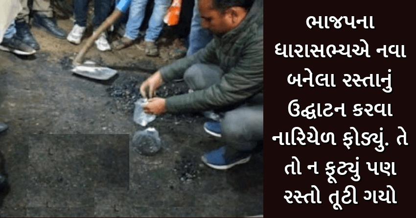ભાજપના ધારાસભ્યએ નવા બનેલા રસ્તાનું ઉદ્ઘાટન કરવા નારિયેળ ફોડ્યું. તે તો ન ફૂટ્યું પણ રસ્તો તૂટી ગયો