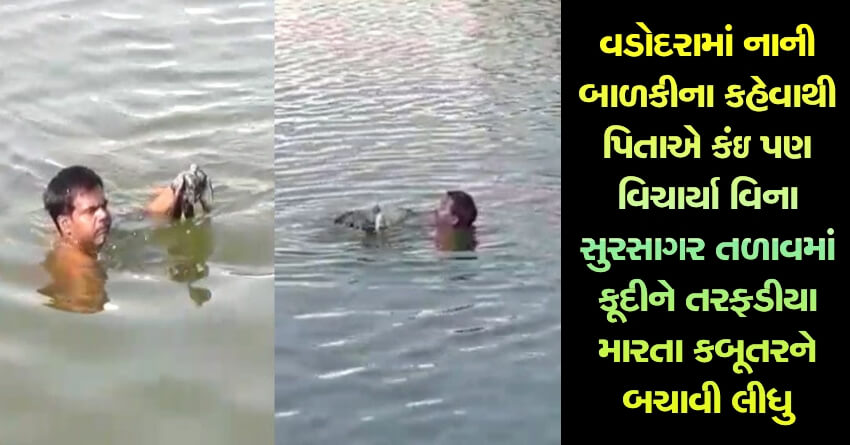 વડોદરામાં નાની બાળકીના કહેવાથી પિતાએ કંઇ પણ વિચાર્યા વિના સુરસાગર તળાવમાં કૂદીને તરફડીયા મારતા કબૂતરને બચાવી લીધુ