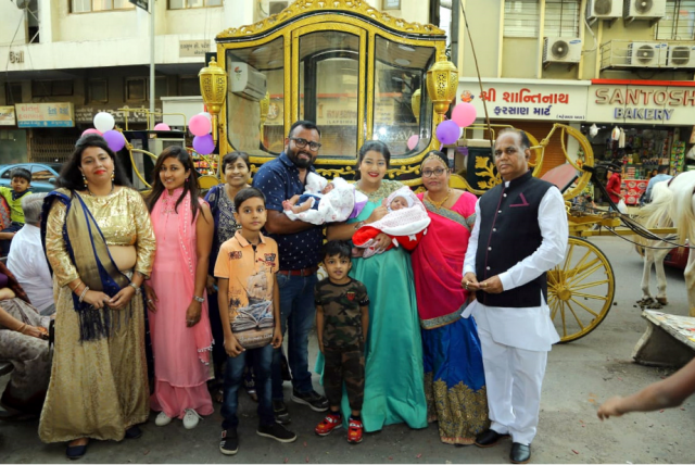ગુજરાતના સુરતમાં રવિવારે ધામધૂમથી લોકો રસ્તા પર નીકળ્યા હતા. અને બેન્ડબાજાવાળાની સાથે લોકો નાચતા-ગાતા એક ઘર સુધી પહોંચ્યા. આ ઘરને પણ ફુલો અને લાઇટોથી શણગારવામાં આવ્યું હતું. આ કોઇ વરરાજાની જાન નહોંતી પરંતુ બે દિકરીઓના જન્મને લઇને તેના પિતાએ આ ગોઠવણ કરી હતી જેમાં બે નવજાત દીકરીઓ અને તેની માતા બગીમાં બેઠા હતા. અને તેઓ વાજતે ગાજતે ઘરે ગયા હતા.