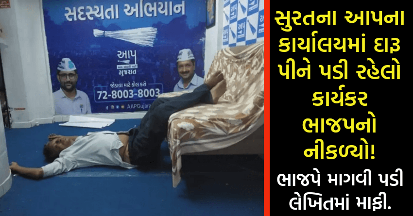 સુરતના આપના કાર્યાલયમાં દારૂ પીને પડી રહેલો કાર્યકર ભાજપનો નીકળ્યો! ભાજપે માગવી પડી લેખિતમાં માફી.