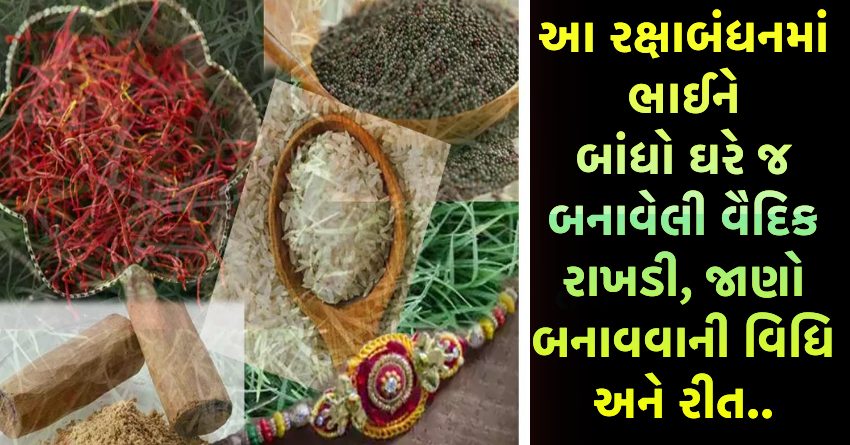 આ માટે 5 વસ્તુઓની જરૂર પડે છે. દુર્વા, ચોખા, કેસર, ચંદન, સરસવના દાણા. આ પાંચ વસ્તુઓને રેશમના કપડામાં બાંધીને સિલાઈ કરી દો. પછી તેને કલાવામાં પરોવી દો. આવી રીતે વૈદિક રાખડી બનાવી શકાય છે.