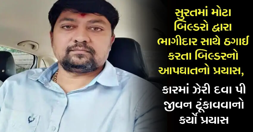 સુરતમાં મોટા બિલ્ડરો દ્વારા ભાગીદાર સાથે ઠગાઈ કરતા બિલ્ડરનો આપઘાતનો પ્રયાસ, કારમાં ઝેરી દવા પી જીવન ટૂંકાવવાનો કર્યો પ્રયાસ