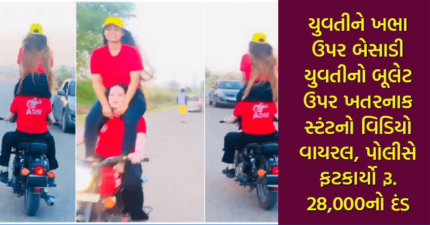 યુવતીને ખભા ઉપર બેસાડી યુવતીનો બૂલેટ ઉપર ખતરનાક સ્ટંટનો વિડિયો વાયરલ, પોલીસે ફટકાર્યો રૂ. 28,000નો દંડ