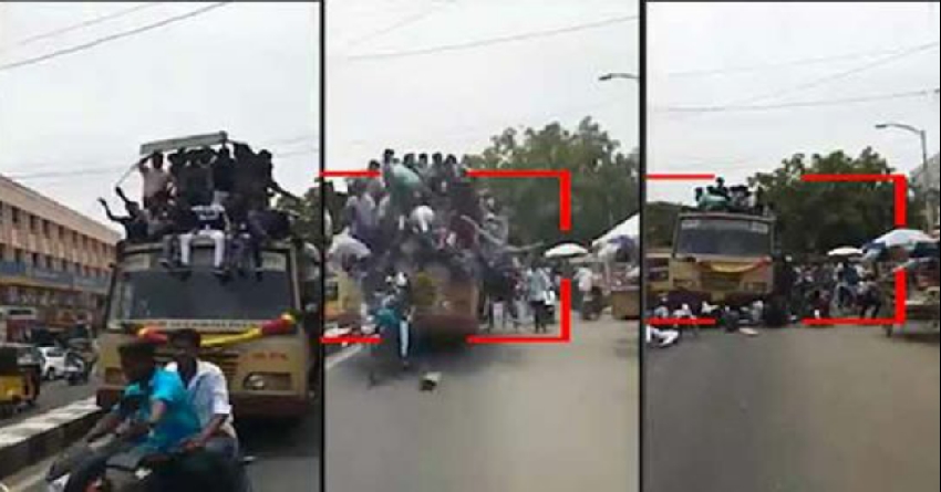 ચેન્નાઈમાં બસ ડે સેલિબ્રેશન સમયે દુર્ઘટના સર્જાઈ હતી. વિદ્યાર્થીઓ બસ પર ચઢી ચિચિયારીઓ કરતાં હતાં. બસ આગળ જઈ રહેલાં બાઈકચાલકે અચાનક બ્રેક મારતાં, બસડ્રાઈવરે પણ બ્રેક મારવાની ફરજ પડી હતી. આથી,બસનાં છાપરે બેઠેલાં 24 વિદ્યાર્થીઓ ધડામ દઈને પડ્યાં હતા. જેમાં 24 વિદ્યાર્થીઓને સામાન્ય ઈજા થઈ હતી. સદનસીબે વિદ્યાર્થીઓનો જીવ બચી ગયો હતો. ઘટનાનો વીડિયો વાઈરલ થઈ રહ્યો છે.