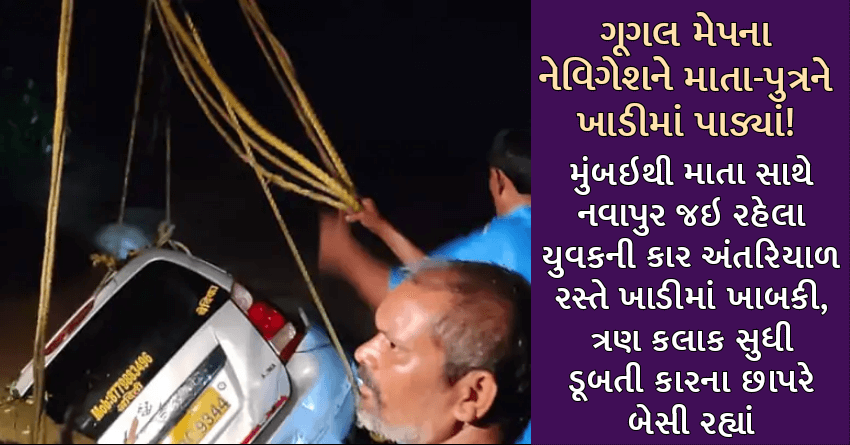 ગૂગલ મેપના નેવિગેશને માતા-પુત્રને ખાડીમાં પાડ્યાં! મુંબઇથી માતા સાથે નવાપુર જઇ રહેલા યુવકની કાર અંતરિયાળ રસ્તે ખાડીમાં ખાબકી, ત્રણ કલાક સુધી ડૂબતી કારના છાપરે બેસી રહ્યાં