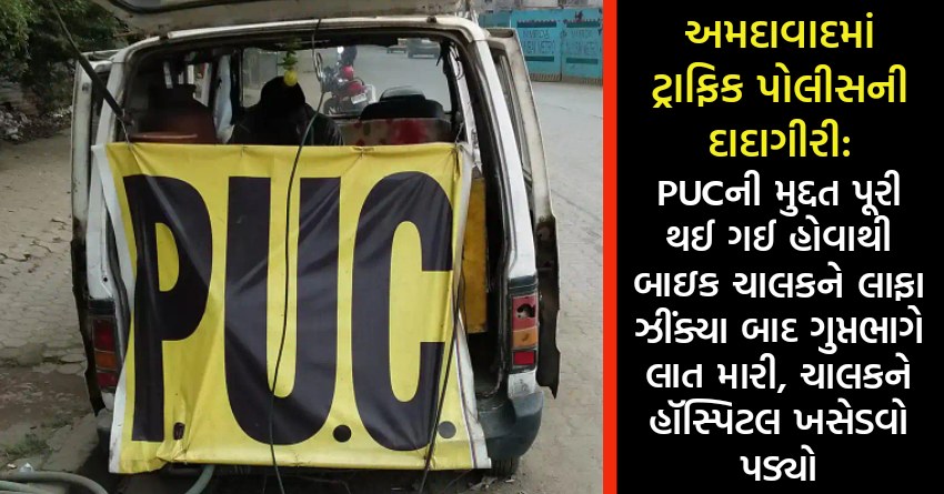 અમદાવાદમાં ટ્રાફિક પોલીસની દાદાગીરી: PUCની મુદ્દત પૂરી થઈ ગઈ હોવાથી બાઇક ચાલકને લાફા ઝીંક્યા બાદ ગુપ્તભાગે લાત મારી, ચાલકને હૉસ્પિટલ ખસેડવો પડ્યો