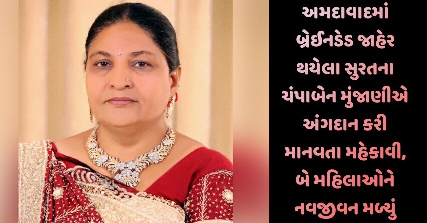 અમદાવાદમાં બ્રેઈનડેડ જાહેર થયેલા સુરતના ચંપાબેન મુંજાણીએ અંગદાન કરી માનવતા મહેકાવી, બે મહિલાઓને નવજીવન મળ્યું