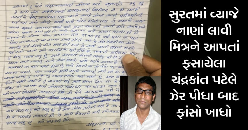 સુરતમાં વ્યાજે નાણાં લાવી મિત્રને આપતાં ફસાયેલા ચંદ્રકાંત પટેલે ઝેર પીધા બાદ ફાંસો ખાધો