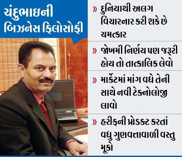 એમની ચેમ્બરની બારીઓ ઝાડ-પાનથી ઢંકાયેલી છે. તેઓ કહે છે, ‘અહીં મધમાખીના મધપૂડા પણ છે. મધમાખીઓ પાણી પી શકે તે માટેની વ્યવસ્થા મેં કરી છે’. પોતાની ફેક્ટરીમાં જ તેમણે ગૌશાળા બનાવી છે. શુદ્ધ ગીર ઓલાદની ૨૫ ગાયો તેમણે રાખી છે. ગાયોની દેખભાળ પણ પોતે જ કરે છે. દેશની ટોચની ફૂડ પ્રોસેસિંગ કંપનીના એમ.ડી.નું આ બીજું રૂપ છે. ચંદુભાઇને મળો ત્યારે લાગે કે આટલો સાલસ અને નિખાલસ માણસ કઇ રીતે કટ્ટર કોમ્પિટિશનમાં સફળ રહી શક્યો હશે ? કદાચ, એ નિખાલસતા જ તેની સફળતાની ગુરુચાવી છે. ચંદુભાઇ હરીફ કંપનીઓના કર્મચારીઓને પણ હોંશપૂર્વક પોતાની ફેક્ટરી અને મશીનો સાથે રહીને બતાવે છે. અહીં બદ્ધું જ ખૂલ્લું છે. ચંદુભાઇને પોતાની પ્રોડક્ટ પર વિશ્વાસ છે, પોતાની મહેનત પર વિશ્વાસ છે.