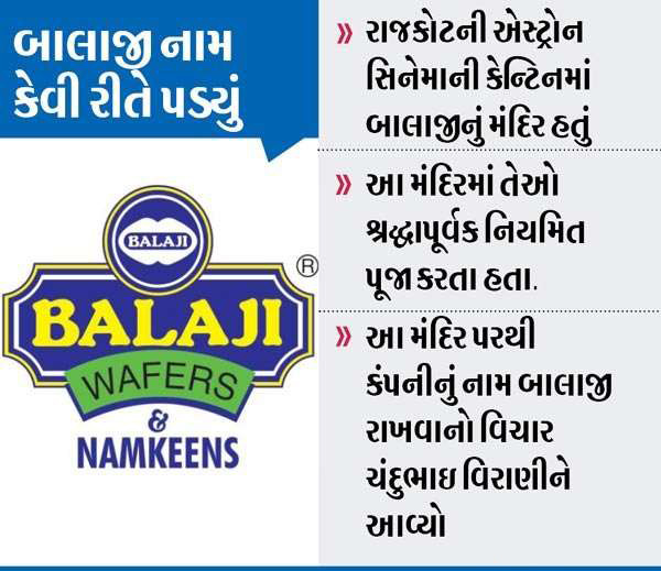 જ્યારે ચંદુભાઇ વિરાણીને એસ્ટ્રોન(રાજકોટ) સિનેમામાં કેન્ટીનનો કોન્ટ્રાક્ટ અમને મળ્યો ત્યાંથી તેમની સફર શરૂ થઇ હતી. રાજકોટની એસ્ટ્રોન સિનેમાની ચંદુભાઇની કેન્ટીનમાં મંદિર હતું. એમાં નિયમિત પૂજા થતી હતી. એમાંથી કંપનીનું નામ બાલાજી રાખવું એવો વિચાર આવ્યો હતો.