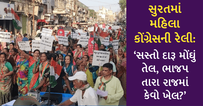 સુરતમાં મહિલા કોંગ્રેસની રેલી: ‘સસ્તો દારૂ મોંઘું તેલ, ભાજપ તારા રાજમાં કેવો ખેલ?’