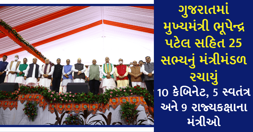 ગુજરાતમાં મુખ્યમંત્રી ભૂપેન્દ્ર પટેલ સહિત 25 સભ્યનું મંત્રીમંડળ રચાયું, 10 કેબિનેટ, 5 સ્વતંત્ર અને 9 રાજ્યકક્ષાના મંત્રીઓ