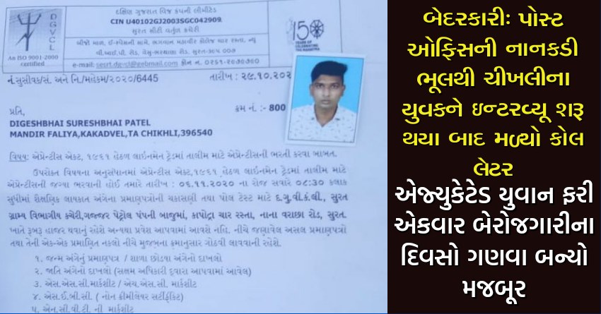 બેદરકારી: પોસ્ટ ઓફિસની નાનકડી ભૂલથી ચીખલીના યુવકને ઇન્ટરવ્યૂ શરૂ થયા બાદ મળ્યો કોલ લેટર, એજ્યુકેટેડ યુવાન ફરી એકવાર બેરોજગારીના દિવસો ગણવા બન્યો મજબૂર