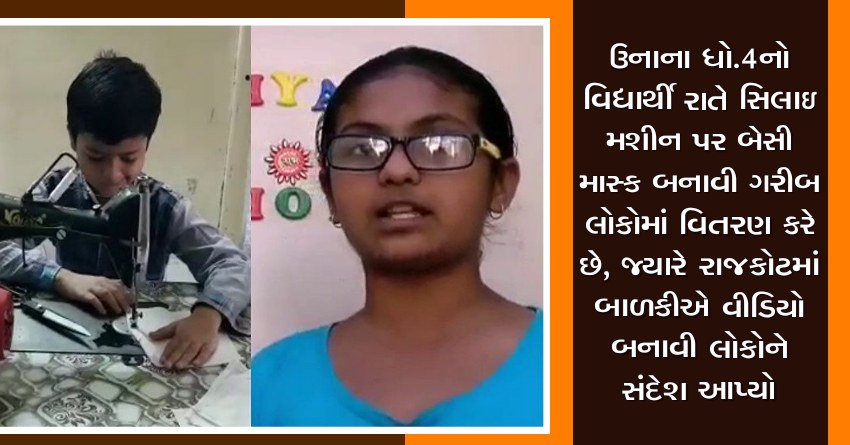 ઉનાના ધો.4નો વિદ્યાર્થી રાતે સિલાઇ મશીન પર બેસી માસ્ક બનાવી ગરીબ લોકોમાં વિતરણ કરે છે, જ્યારે રાજકોટમાં બાળકીએ વીડિયો બનાવી લોકોને સંદેશ આપ્યો