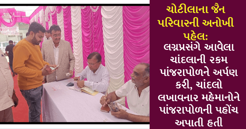 ચોટીલાના જૈન પરિવારની અનોખી પહેલ: લગ્નપ્રસંગે આવેલા ચાંદલાની રકમ પાંજરાપોળને અર્પણ કરી, ચાંદલો લખાવનાર મહેમાનોને પાંજરાપોળની પહોંચ અપાતી હતી
