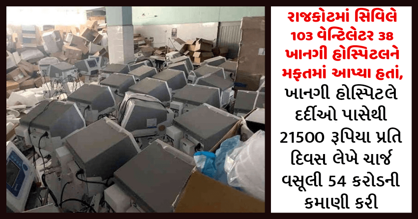 રાજકોટમાં સિવિલે 103 વેન્ટિલેટર 38 ખાનગી હોસ્પિટલને મફતમાં આપ્યા હતાં, ખાનગી હોસ્પિટલે દર્દીઓ પાસેથી 21500 રૂપિયા પ્રતિ દિવસ લેખે ચાર્જ વસૂલી 54 કરોડની કમાણી કરી