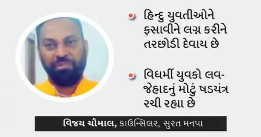 ભાજપના સુરતના કોર્પોરેટર વિજય ચૌમાલ દ્વારા માંગ કરવામાં આવી રહી છે કે, વિધર્મીઓ સામે હવે સરકારે કડક હાથે કામગીરી કરવી જોઈએ. તેમણે કેટલાક મહત્વના પ્રશ્નો ઉભા કર્યા છે. કેટલાક વિસ્તારોમાં વિધર્મી યુવકો લવજેહાદનો મોટું ષડયંત્ર રચી રહ્યા છે, તો લેન્ડ જેહાદને લઈને પણ કિસ્સાઓ સામે આવ્યા હોવાનું તેમણે સ્વીકાર્યું હતું. તેમણે મુસ્લિમ યુવાનોની માનસિકતાના મૂળમાં જવા માટેનો પ્રયાસ કરવા માટે હાકલ કરી છે. કિશન ભરવાડની હત્યા હોય કે, કમલેશ તિવારી હત્યા હોય આ પ્રકારના ષડયંત્રો ખૂબ જ ગંભીર બાબત ગણી શકાય.
