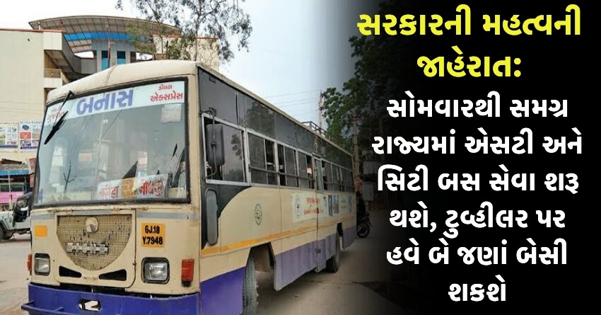 સરકારની મહત્વની જાહેરાત: સોમવારથી સમગ્ર રાજ્યમાં એસટી અને સિટી બસ સેવા શરૂ થશે, ટુવ્હીલર પર હવે બે જણાં બેસી શકશે