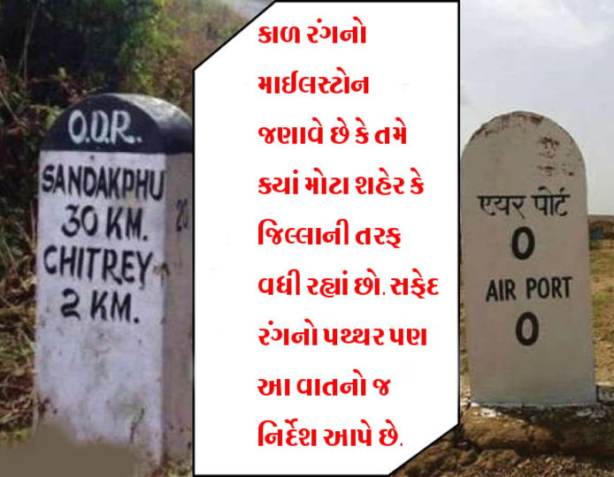 કાળ રંગનો માઈલસ્ટોન જણાવે છે કે તમે કયાં મોટા શહેર કે જિલ્લાની તરફ વધી રહ્યાં છો. સફેદ રંગનો પથ્થર પણ આ વાતનો જ નિર્દેશ આપે છે.