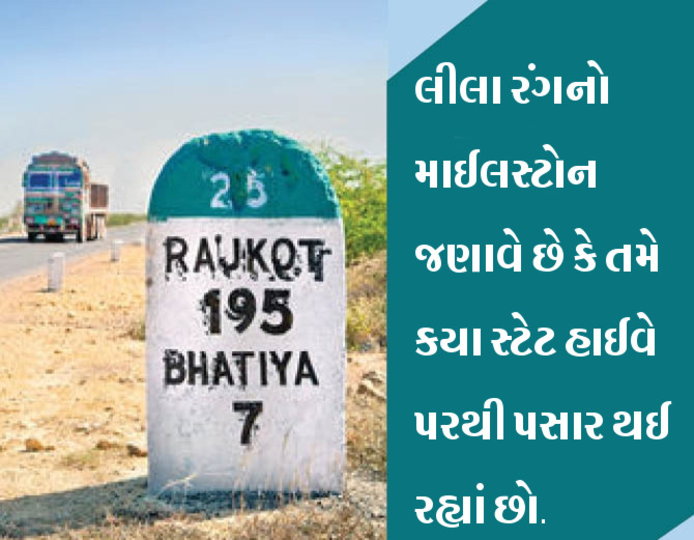 લીલા રંગનો માઈલસ્ટોન જણાવે છે કે તમે કયા સ્ટેટ હાઈવે પરથી પસાર થઈ રહ્યાં છો.