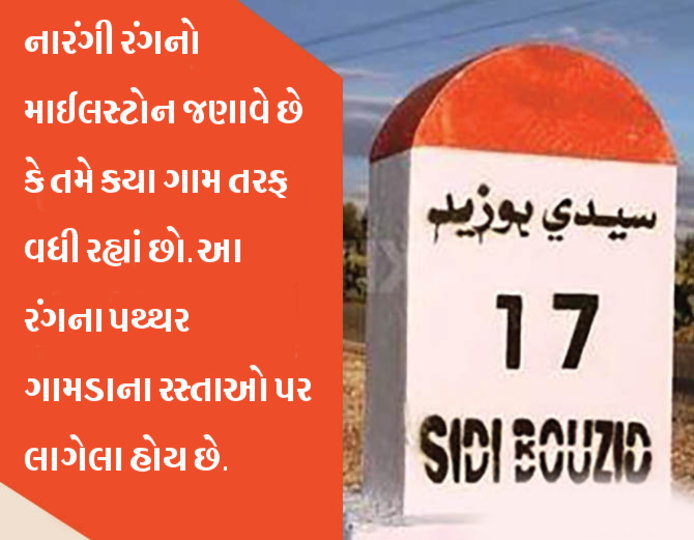 નારંગી રંગનો માઈલસ્ટોન જણાવે છે કે તમે કયા ગામ તરફ વધી રહ્યાં છો. આ રંગના પથ્થર ગામડાના રસ્તાઓ પર લાગેલા હોય છે.