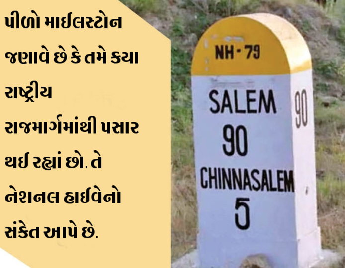 પીળો માઈલસ્ટોન જણાવે છે કે તમે કયા રાષ્ટ્રીય રાજમાર્ગમાંથી પસાર થઈ રહ્યાં છો. તે નેશનલ હાઈવેનો સંકેત આપે છે.