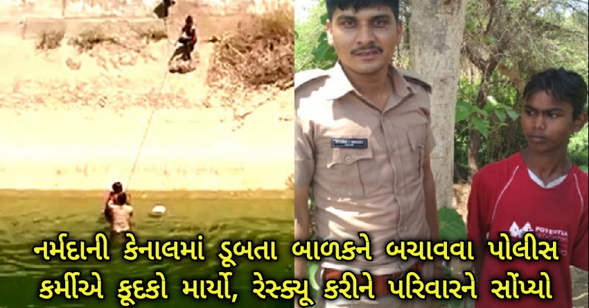 નર્મદાની કેનાલમાં ડૂબતા બાળકને બચાવવા પોલીસ કર્મીએ કૂદકો માર્યો, રેસ્ક્યૂ કરીને પરિવારને સોંપ્યો