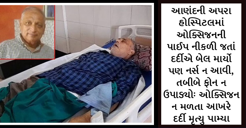 આણંદની અપરા હોસ્પિટલમાં ઓક્સિજનની પાઈપ નીકળી જતાં દર્દીએ બેલ માર્યો પણ નર્સ ન આવી, તબીબે ફોન ન ઉપાડ્યોઃ ઓક્સિજન ન મળતા આખરે દર્દી મૃત્યુ પામ્યા