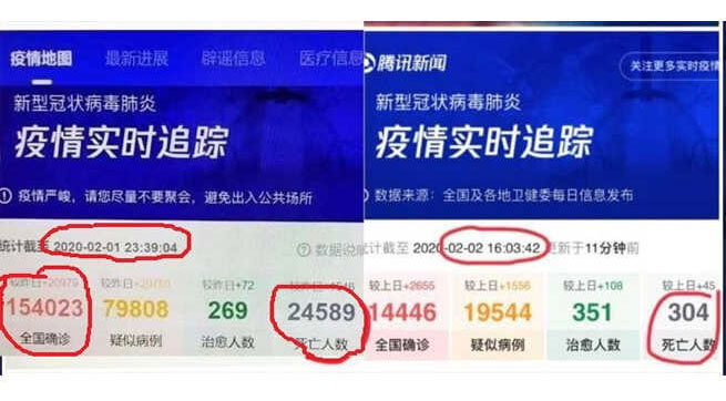 તાઇવાનના સમાચાર પત્ર તાઇવાન ન્યૂઝના રિપોર્ટ પ્રમાણે ચીનની કંપની ટેનસેંટે શનિવારના રોજ કહ્યું કે કોરોના વાયરસથી 154,023 લોકોને અસર થઇ છે અને 24,589 લોકોના મોત થઇ ગયા છે. ટેનસેંટનો આ આંકડો ચીનના સત્તાવાર આંકડા કરતા લગભગ 80 ગણો વધુ હતો. જો કે બાદમાં તેમણે પોતાના આંકડામાં ફેરફાર કર્યો અને કહ્યું કે 14,446 લોકો જ બીમારીથી પીડિત છે અને 304 લોકોના મોત થયા છે.