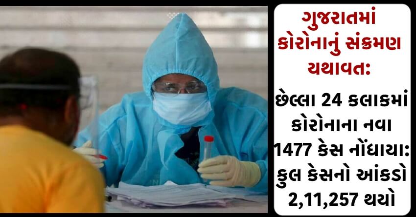 ગુજરાતમાં કોરોનાનું સંક્રમણ યથાવત: છેલ્લા 24 કલાકમાં કોરોનાના નવા 1477 કેસ નોંધાયા: કુલ કેસનો આંકડો 2,11,257 થયો