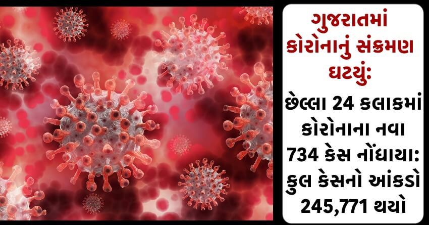 ગુજરાતમાં કોરોનાનું સંક્રમણ ઘટયું: છેલ્લા 24 કલાકમાં કોરોનાના નવા 734 કેસ નોંધાયા: કુલ કેસનો આંકડો 245,771 થયો