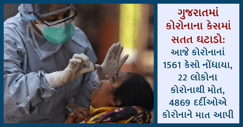 ગુજરાતમાં કોરોનાના કેસમાં સતત ઘટાડો: આજે કોરોનાનાં 1561 કેસો નોંધાયા, 22 લોકોના કોરોનાથી મોત, 4869 દર્દીઓએ કોરોનાને માત આપી
