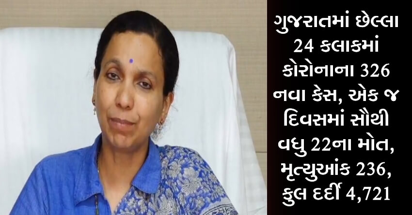 ગુજરાતમાં છેલ્લા 24 કલાકમાં કોરોનાના 326 નવા કેસ, એક જ દિવસમાં સૌથી વધુ 22ના મોત, મૃત્યુઆંક 236, કુલ દર્દી 4,721