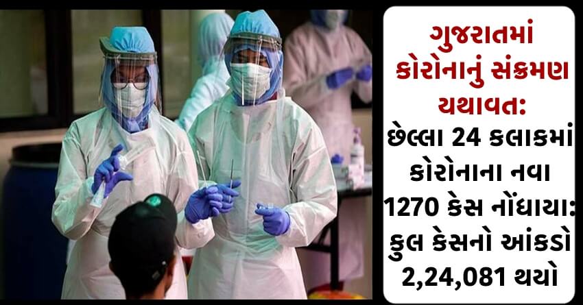 ગુજરાતમાં કોરોનાનું સંક્રમણ યથાવત: છેલ્લા 24 કલાકમાં કોરોનાના નવા 1270 કેસ નોંધાયા: કુલ કેસનો આંકડો 2,24,081 થયો
