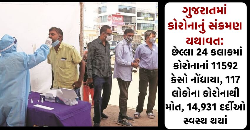 ગુજરાતમાં કોરોનાનું સંક્રમણ યથાવત: છેલ્લા 24 કલાકમાં કોરોનાનાં 11592 કેસો નોંધાયા, 117 લોકોના કોરોનાથી મોત, 14,931 દર્દીઓ સ્વસ્થ થયાં