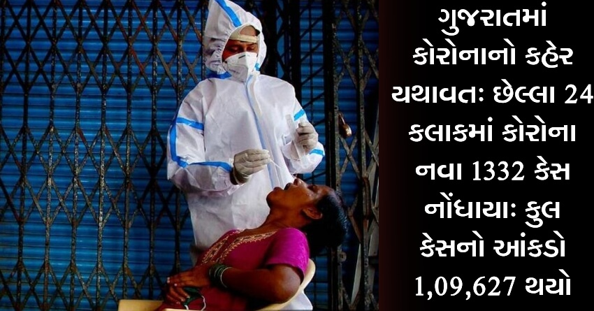 ગુજરાતમાં કોરોનાનો કહેર યથાવત: છેલ્લા 24 કલાકમાં કોરોના નવા 1332 કેસ નોંધાયા: કુલ કેસનો આંકડો 1,09,627 થયો