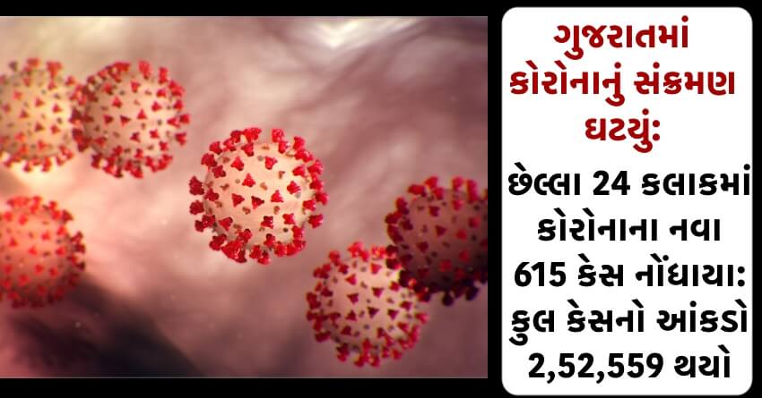 ગુજરાતમાં કોરોનાનું સંક્રમણ ઘટયું: છેલ્લા 24 કલાકમાં કોરોનાના નવા 615 કેસ નોંધાયા: કુલ કેસનો આંકડો 2,52,559 થયો