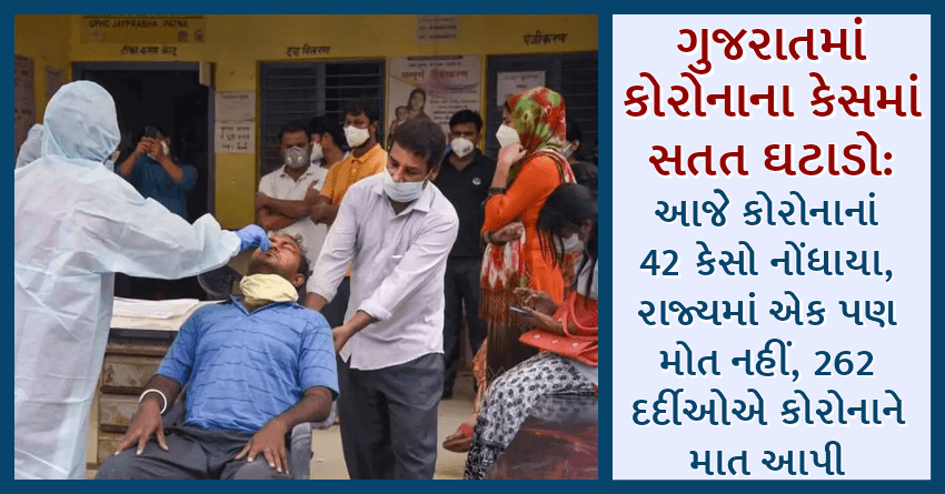 ગુજરાતમાં કોરોનાના કેસમાં સતત ઘટાડો: આજે કોરોનાનાં 42 કેસો નોંધાયા, રાજ્યમાં એક પણ મોત નહીં, 262 દર્દીઓએ કોરોનાને માત આપી