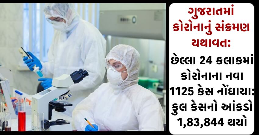 ગુજરાતમાં કોરોનાનું સંક્રમણ યથાવત: છેલ્લા 24 કલાકમાં કોરોનાના નવા 1125 કેસ નોંધાયા: કુલ કેસનો આંકડો 1,83,844 થયો