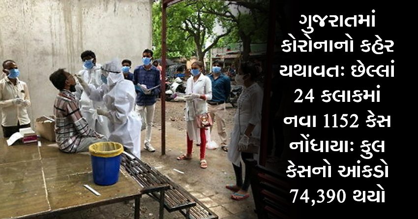 ગુજરાતમાં કોરોનાનો કહેર યથાવત: છેલ્લાં 24 કલાકમાં નવા 1152 કેસ નોંધાયા: કુલ કેસનો આંકડો 74,390 થયો