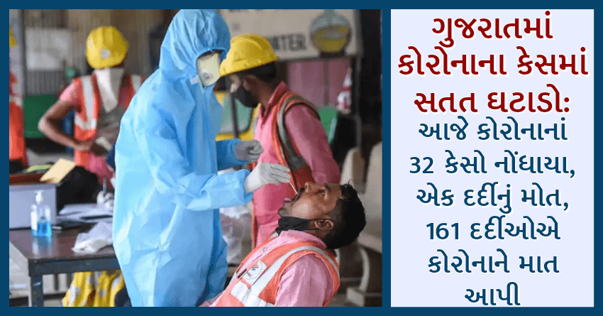 ગુજરાતમાં કોરોનાના કેસમાં સતત ઘટાડો: આજે કોરોનાનાં 32 કેસો નોંધાયા, એક દર્દીનું મોત, 161 દર્દીઓએ કોરોનાને માત આપી
