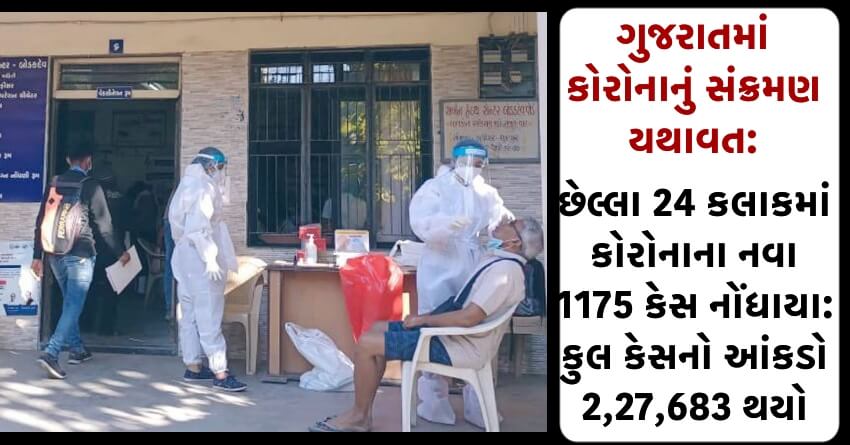 ગુજરાતમાં કોરોનાનું સંક્રમણ યથાવત: છેલ્લા 24 કલાકમાં કોરોનાના નવા 1175 કેસ નોંધાયા: કુલ કેસનો આંકડો 2,27,683 થયો