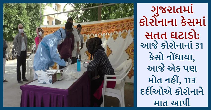 ગુજરાતમાં કોરોનાના કેસમાં સતત ઘટાડો: આજે કોરોનાનાં 31 કેસો નોંધાયા, આજે એક પણ મોત નહીં, 113 દર્દીઓએ કોરોનાને માત આપી
