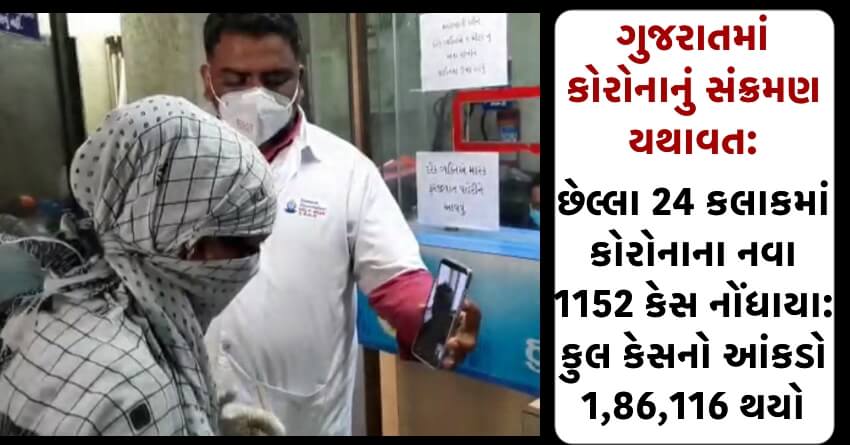 ગુજરાતમાં કોરોનાનું સંક્રમણ યથાવત: છેલ્લા 24 કલાકમાં કોરોનાના નવા 1152 કેસ નોંધાયા: કુલ કેસનો આંકડો 1,86,116 થયો