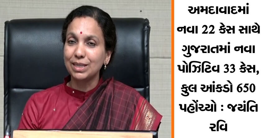આજે અમદાવાદમાં નવા 22 કેસ સાથે ગુજરાતમાં નવા પોઝિટિવ 33 કેસ, કુલ આંકડો 650 પહોંચ્યો : જયંતિ રવિ