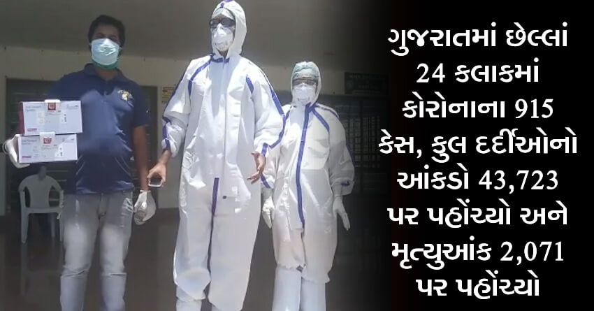 ગુજરાતમાં છેલ્લાં 24 કલાકમાં કોરોનાના 915 કેસ, કુલ દર્દીઓનો આંકડો 43,723 પર પહોંચ્યો અને મૃત્યુઆંક 2,071 પર પહોંચ્યો